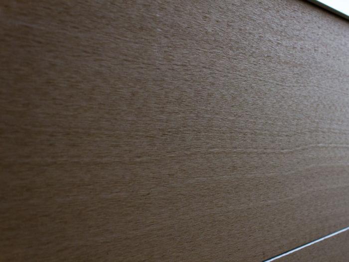 Die Oberfläche der WPC-Füllung ist in ihrer Struktur exotischen Harthölzern nachempfunden. Entsprechend ist die Oberflächenstruktur leicht porig.